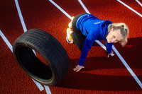 Hyötykäyttö: Suomen nopein 45-vuotias nainen, Jasmina Glad, ottaa uusitulla Veikkolan kentällä lisää kierroksia parantaakseen omaa ennätystään. Veikkolan Veikkojen kotiradalla on ensimmäistä kertaa hyödynnetty suomalaisista renkaista valmistettua uusiomateriaalia.