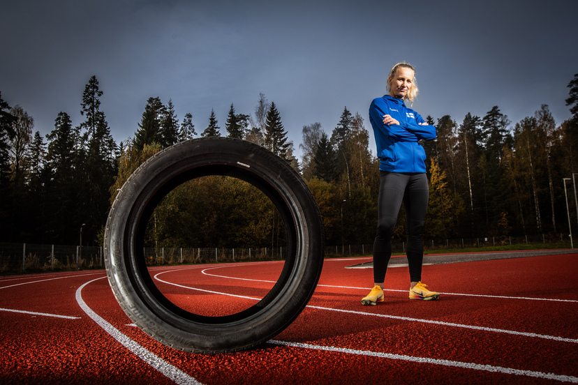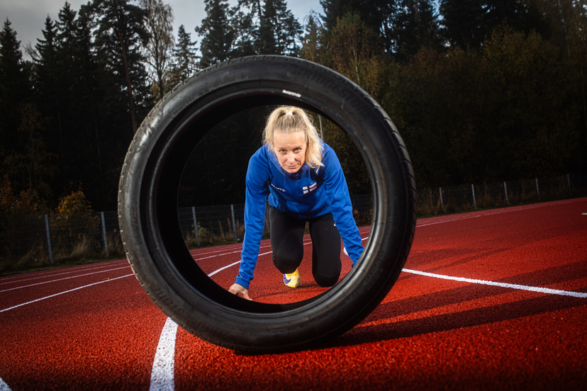 Hyötykäyttö: Suomen nopein 45-vuotias nainen, Jasmina Glad, ottaa uusitulla Veikkolan kentällä lisää kierroksia parantaakseen omaa ennätystään. Veikkolan Veikkojen kotiradalla on ensimmäistä kertaa hyödynnetty suomalaisista renkaista valmistettua uusiomateriaalia.